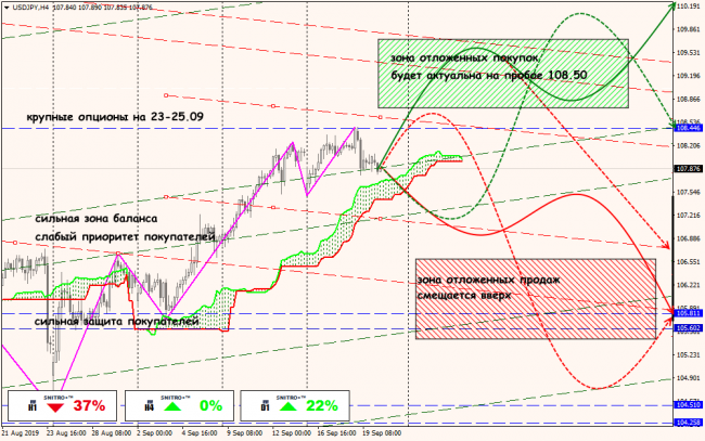 USD/JPY показала среднесрочный max после решения BOJ сохранить базовые параметры и целевую доходность 10-летних госбумаг в зоне нуля. Несколько недель спекулянтами раскручивалась тема сильной коррекции монетарной политики, тем более, что в июле центробанк все-таки скорректировал объем приобретаемых ежегодно бумаг биржевых индексных фондов. Сам по себе факт непримечательный, хотя регулятор заявил, что пересмотрит экономические и ценовые изменения 31 октября. По заявлению Куроды, вопрос дальнейшего снижения ставки все еще актуален, но на текущий момент экономика достаточно устойчива. Антирисковые идеи стали менее активными после того, как Трамп отложил повышение пошлин и была определена дата очередного сеанса переговоров США-Китай. Тем не менее, короткие позиции рекомендуются очень осторожно.